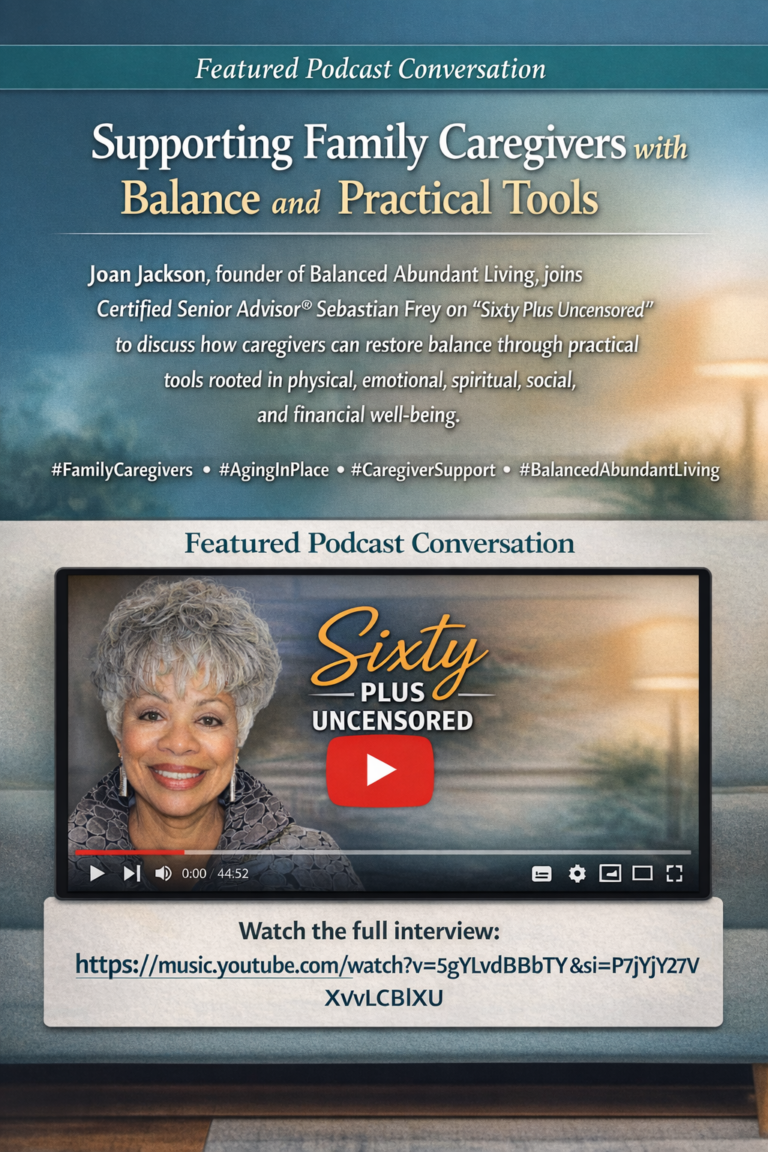 Joan Jackson, Certified Senior Advisor®, joins Sebastian Frey on Sixty Plus Uncensored to discuss the realities of family caregiving and the Five Pillars of well-being that guide her work at Balanced Abundant Living.